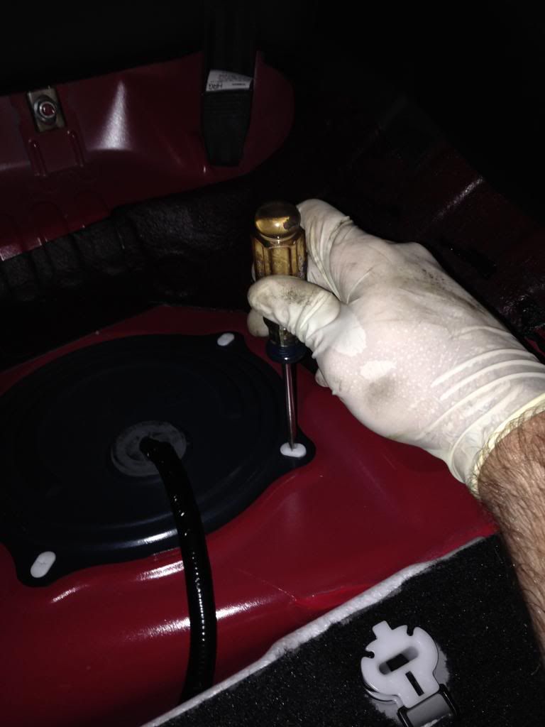 4.) Using a philips head screw driver, turn the 4 white plastic tabs that hold the fuel pump cover on the car body.